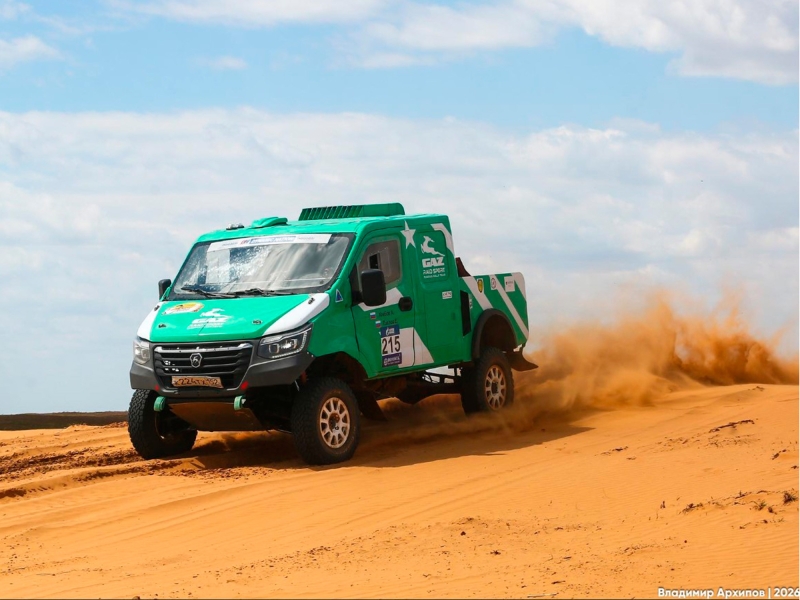 В Астрахани 26 апреля прошёл второй соревновательный день гонки «Золото Кагана» – первого этапа чемпионата России по ралли-рейдам для внедорожников, багги и грузовиков, первого этапа чемпионата России по кросс-кантри ралли МФР и областного соревнования по ралли-рейдам «Кубок губернатора». Участников ждал серьёзный спецучасток протяжённостью 250 км, включивший всё разнообразие астраханского рельефа: скоростные прямые участки, вязкий песок, заросшие кустарником дюны («кочкарник»), которые организаторы перемешали зоной обязательной нейтрализации. Погода сжалилась над гонщиками: после холодного и дождливого пролога, состоявшегося накануне, выглянуло солнце, и столбик термометра поднялся до комфортных +18 °C. Однако главные сложности подготовила не природа, а навигация, технические проблемы и жёсткий норматив времени. Сразу несколько экипажей столкнулись со сбоями спутниковой навигации и радиосвязи, вызванными работой локальных средств РЭБ в районе гонки. Некоторым участникам пришлось вспоминать старые добрые бумажные легенды. Давала сбои и техника: у экипажа Александра Мироненко (№206) на СУ2 возникли серьёзные проблемы с редуктором. Долго пытались починить, но в итоге не смогли финишировать и получили от судей временной штраф – 25 часов, что фактически вывело их из борьбы за места на подиуме. Экипаж Андрея Голобородько (№209) второй день подряд боролся с неполадками в трансмиссии, финишировал по асфальту, а за пропуск контрольных точек получил штраф почти в 13 часов. Экипаж Михаила Расторгуева (№216) на Nissan Pathfinder и вовсе сошёл с дистанции, так как не смог устранить технические неисправности. В абсолютном зачёте Т1 экипаж Андрея Рудского и Дмитрия Карпова на G‑Force TIGRIS (№203), стремясь подняться повыше в первой десятке турнирной таблицы, устроил догонялки с КАМАЗами и багги Т3. Андрей Рудской пилот команды «НГ Энерго» В грузовом зачёте Т5 лидирует экипаж Дмитрия Сотникова на КАМАЗе (2:55:38). Второй – Сергей Вязович на МАЗе (+1:11), третий – Богдан Каримов на КАМАЗе. Борьба в зачёте плотная, и все интересные баталии ещё впереди. В Т3 победу одержал Алексей Черкесов на Can‑Am, а в категории R – Алексей Хлебов на «ГАЗели NN». Сегодня такой день непростой: много кочкарника и совсем немного скоростных участков. Мы атаковали, потому что соперники серьёзные, нужно было создать задел. 10 минут отрыва — это немного, но мы можем держать темп чуть выше, чем соперники. Пока расклад такой: нужно искать компромисс для машины и поатаковать Евгений Павлов штурман команды «ГАЗ Рейд Спорт» В категории Т2 на «Соболе NN» Александр Семёнов и Дмитрий Охотников (№225) заняли 29-е место в абсолюте и пятое в своём зачёте Т2; отставание от лидирующего в категории действующего чемпиона Андрея Сушенцова составляет более 2,5 часа. Александр Семёнов так подвёл итог первого испытания машины в настоящих песках в режиме гонки: Машина на порядок выше старой. По мотору очень резвая, для песков и дюн подходит идеально. Ехали и наслаждались. Надо настроить подвеску, чтобы выстреливала – к следующей гонке исправим. В грузовом зачёте Т5 экипаж Владимира Моисеева и Александра Лагуты (№310) показал время 4:10:32, заняв 23-е место в абсолюте. А экипаж Михаила Шкляева (№309) и Александра Шелудько столкнулся с техническими проблемами, но в рекордное время, всего за час, устранил поломку ходовой части. 